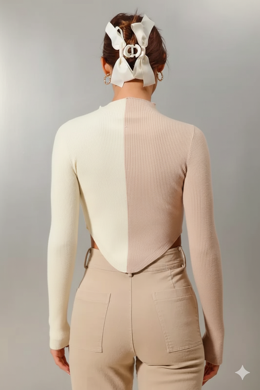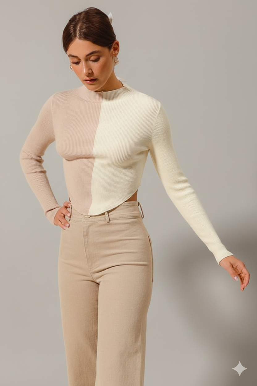 Elevate your basics with the SO ME Color Block Fitted Crop Sweater Top. Crafted in a ribbed stretch knit blend (80% Rayon, 20% Nylon), this piece hugs your shape while offering breathability and comfort. Featuring a high neckline, long sleeves, and a sharp dual‑tone color‑block design in Taupe/Ivory, it’s perfect for balancing modesty and trend. Cropped at just the right length to pair with high‑waist jeans or skirts, it transitions seamlessly from layered fall looks to standout standalone outfits.