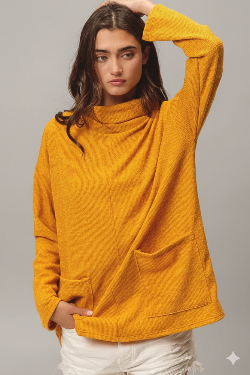 Wrap yourself in softness with the BiBi Piper Rib Double Pocket Turtle Neck Sweater. With an oversized cut, ribbed texture, and generous turtle neckline, this sweater combines comfort and casual elegance. The double front pockets are perfect for warming hands or storing small essentials. Slight stretch offers freedom of movement, while the 80% rayon / 20% polyester blend keeps the fabric soft and smooth against the skin. Whether you pair it with leggings for lounging or tucked into jeans for a weekend brunch, it’s a versatile must‑have.