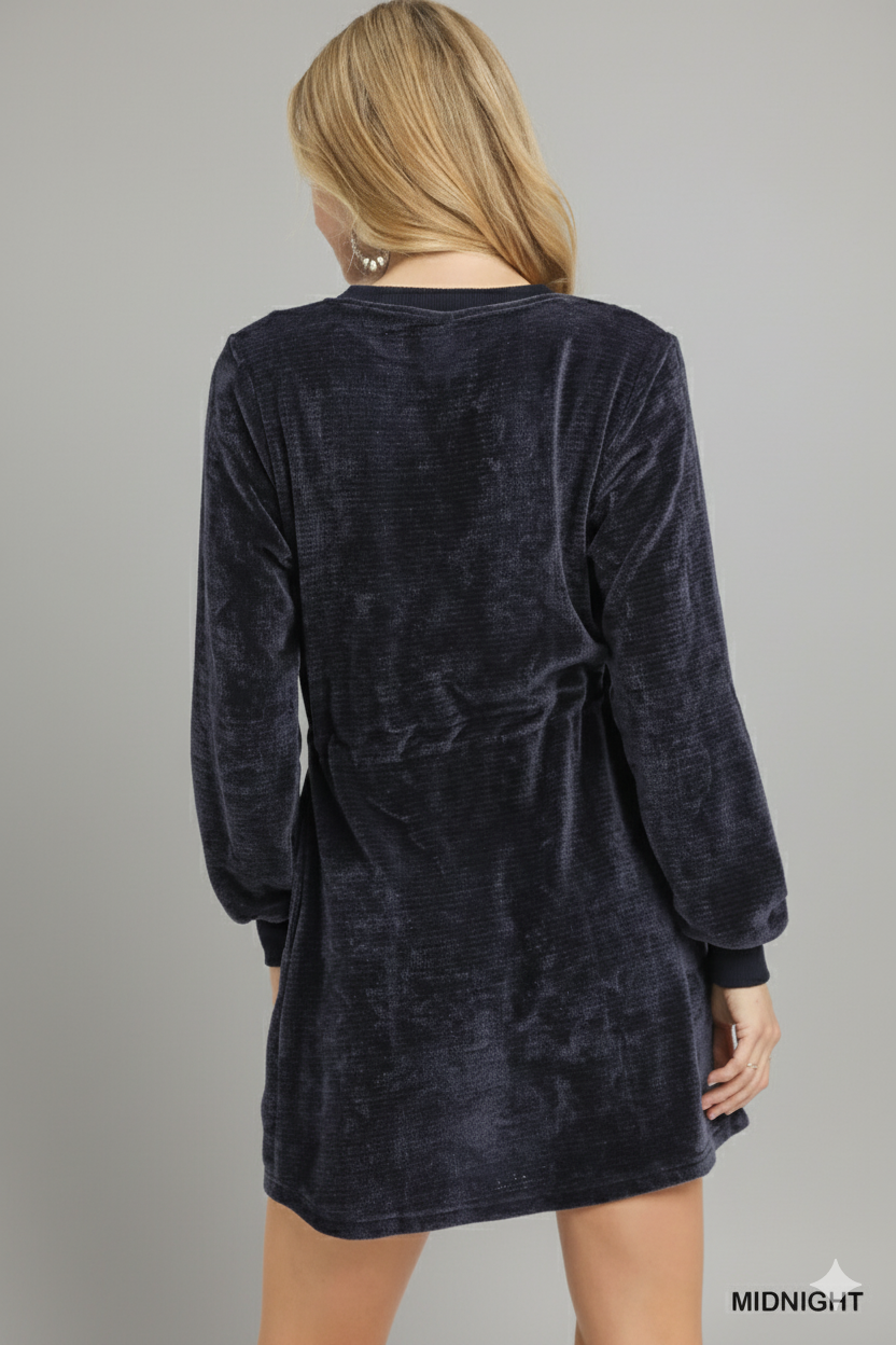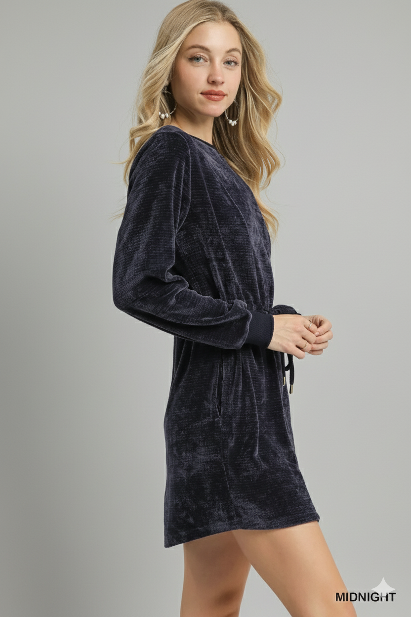 Slide into elegance with this Umgee Velour Drawstring Mini Dress—where plush texture and flattering design meet for full impact. Crafted from ultra‑soft velour (100% polyester) with a subtle stretch, this dress drapes beautifully while offering comfort and style. Long sleeves keep you cozy in cooler weather, and the drawstring waist lets you adjust the fit to flatter your figure. The “Midnight” color offers a sleek, versatile tone perfect for evening outings or elevated day looks. A luxe mini that’s both playful and polished.
