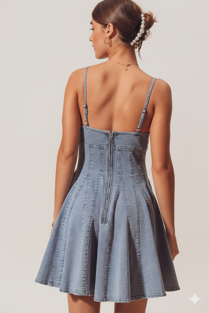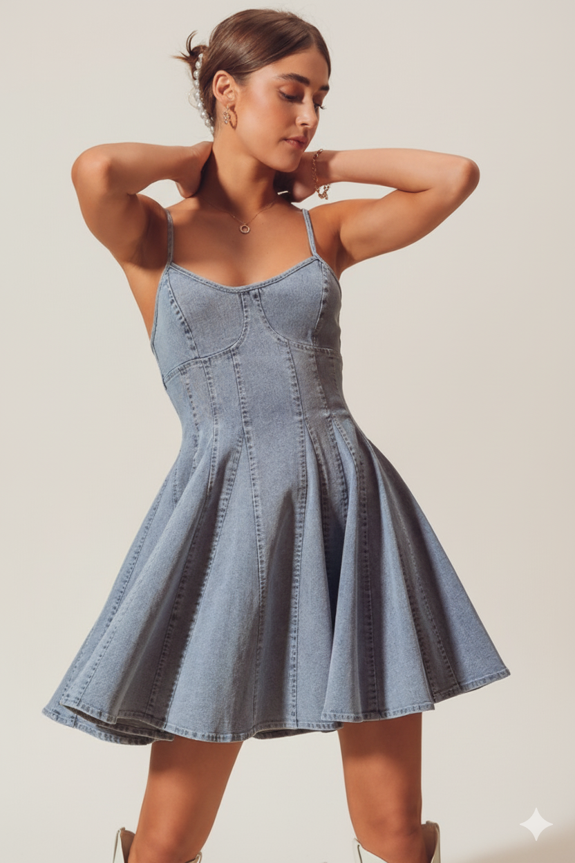 Refresh your wardrobe with this charming A‑Line Fit and Flare Denim Mini Dress. Its flattering silhouette—a fitted waist with a gently pleated skirt—offers a feminine shape that’s easy to wear. Crafted from a soft, slight-stretch denim (80% cotton, 20% polyester), this dress balances structure and ease for effortless all-day wear. Simple and versatile, it's perfect for styling up or down—great with sneakers or dressed up with boots and a jacket.