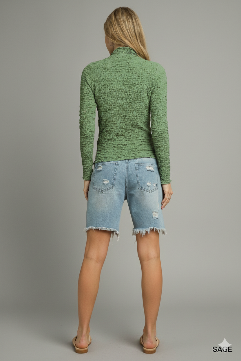 This Umgee Textured Crinkle Knit Long Sleeve Top delivers both comfort and style. Made from a stretchy, lightweight fabric blend (50% cotton, 40% nylon, 10% spandex), it features a textured crinkle knit that adds visual depth and wrinkle resistance. Full long sleeves give you warmth and coverage, while the drapey cut flatters without clinging. Available in Sage and classic neutrals, this top transitions effortlessly from relaxed day wear to a styled evening look.
